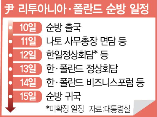 윤석열 대통령이 이달 10~15일 4박 6일간의 동유럽 순방에 나선다. 윤 대통령은 리투아니아에서 열리는 북대서양조약기구(NATO·나토) 정상회의에서 자유주의 진영 국가들과 러시아·중국 등 권위주의 진영에 맞서 안보와 공급망 협력을 확대한다. 또 폴란드를 공식 방문해 방산과 원전, 우크라이나 재건 사업을 위한 세일즈 외교를 벌일 예정이다.