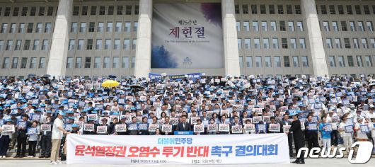 (서울=뉴스1) 임세영 기자 = 이재명 더불어민주당 대표, 박광온 원내대표 등 참석자들이 7일 오전 서울 여의도 국회 본청 앞에서 열린 윤석열정부 오염수 투기 반대 촉구 결의대회에서 피켓을 들고 구호를 외치고 있다. 2023.7.7/뉴스1seiyu@news1.krCopyright ⓒ 뉴스1. All rights reserved. 무단 전재 및 재배포 금지.