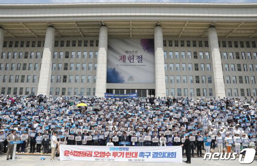 (서울=뉴스1) 임세영 기자 = 이재명 더불어민주당 대표, 박광온 원내대표 등 참석자들이 7일 오전 서울 여의도 국회 본청 앞에서 열린 윤석열정부 오염수 투기 반대 촉구 결의대회에서 피켓을 들고 구호를 외치고 있다. 2023.7.7/뉴스1