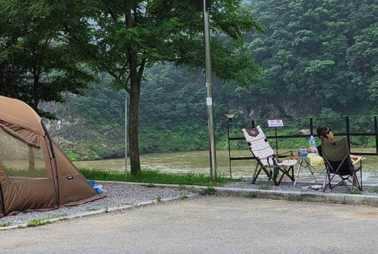 전날 쏟아진 비가 갠 아침 강원 영월 동강 오토캠핑장 모습. 앞에는 동강이 흐르고 있다. |