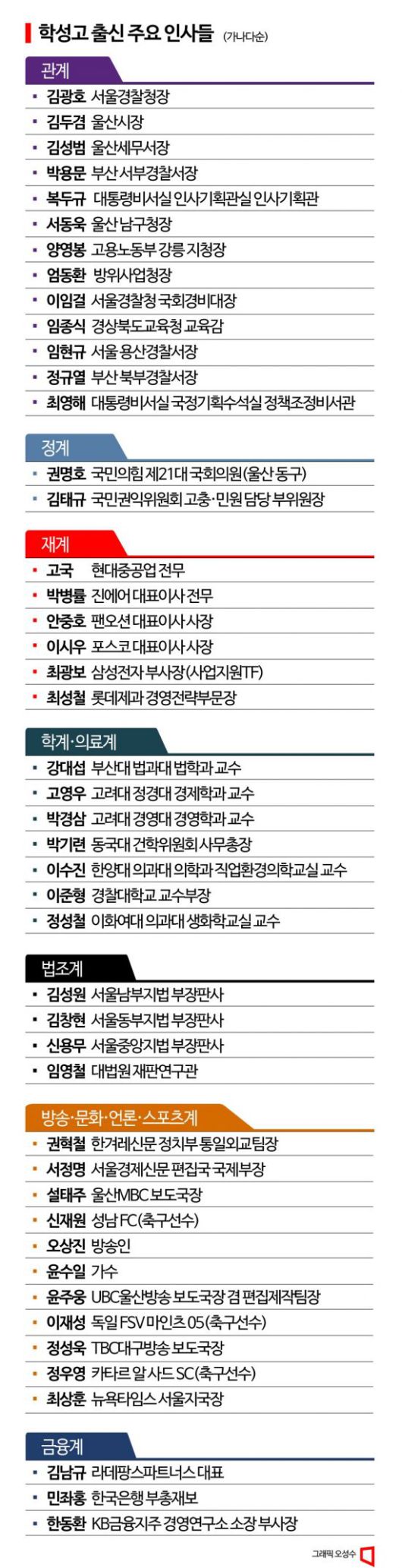 울산광역시 남구 문수로에 있는 학성고등학교(학성고)는 박정희 정부 때 핵심 인물이었던 이후락 전 중앙정보부장이 설립을 주도했다. 학교명 '학성'은 이후락의 본관인 울산의 옛 이름(지명)을 따서 지었다고 한다. 울산육영회 소유 사립고등학교로 1969년에 개교했고, 1982년 공립으로 전환했다. 학구열이 높아 명문대 진학률이 높고, 이렇다 보니 자연스럽게 사회에서 두각을 나타낸 동문이 많다. 학성고 출신은 정·관계는 물론 학계·금융·의료계 등 사회 곳곳에서 모교를 빛내고 있다.윤석열 정부와 관련해서는 복두규 대통령실 인사기획관(전 대검 사무국장,11회)이 먼저 눈에 띈다. 인사기획관은 대통령실과 정부 부처, 공기업 인사를 총괄하는 자리다. 폐지된 인사수석을 대체하는 자리라 언론들은 '수석급 인선'이라고 평가했다. 복 기획관과 함께 근무했던 한 전직 검사장은 당시 언론 인터뷰에서 "(복 기획관은)정말 입이 무겁다. 꼼꼼하고 치밀한 스타일"이라고 전하기도 했다. 복 기획관이 발탁된 배경과 관련해서도 그의 '무거운 입'이 한몫했을 것이란 분석이 나왔었다. 그는 윤 대통령과 대검 중수부 등에서 함께 근무한 인연이 있다.