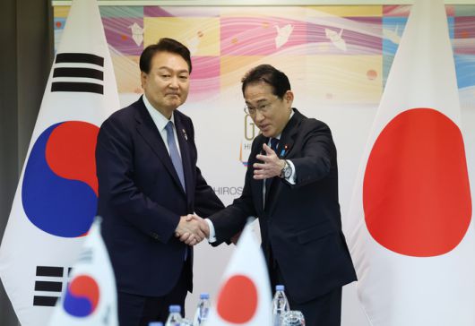 G7 정상회의 참관국 자격으로 일본을 방문 중인 윤석열 대통령이 21일 히로시마 평화기념공원 국제회의장에서 열린 한일 정상회담에서 기시다 후미오 일본 총리와 악수하고 있다. 연합뉴스 |