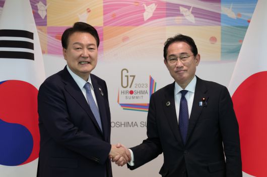 윤석열 대통령과 기시다 후미오 일본 총리가 지난 5월 히로미사에서 한·일 정상회담을 열고 악수를 나누고 있다. 대통령실 제공 |