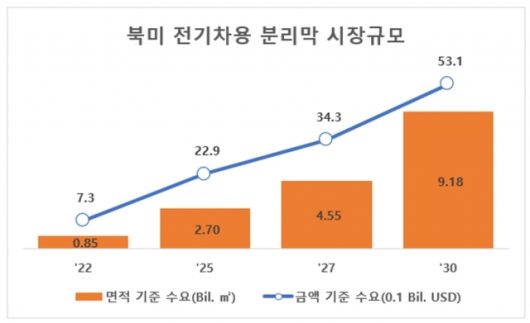 보고서에 따르면 북미 전기차용 분리막 시장은 2022년 8억5000만㎡에서 2030년 91억8000만㎡ 수준으로 연평균 35% 성장할 것으로 예상된다. 북미, 유럽, 중국, 아시아, 기타 지역으로 구분할 때 가장 높은 연평균 성장률이다. 금액 기준으론 2022년 7억3000만달러(약 9516억원)에서 2030년에는 53억1000만달러(약 6조9231억원)로 연평균 28% 성장할 전망이다.
