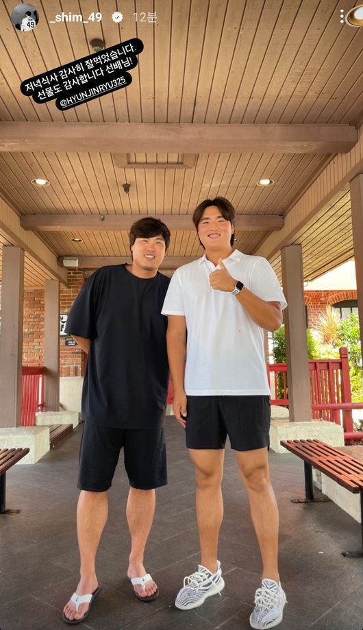 심준석은 자신의 인스타그램에 류현진과 함께 찍은 사진을 게재하고 "저녁 식사 감사히 잘 먹었습니다. 선물도 감사합니다. 선배님!"이라고 글을 남겼다. /what@osen.co.kr