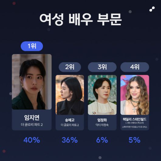 여성 배우 부문 역시 [더 글로리 파트 2] 배우들의 박빙 승부가 펼쳐졌다. 박연진 역을 맡은 임지연이 40%로 1위에 올랐으며, 문동은 역의 송혜교가 4% 차이인 36%로 뒤따랐다. 한편 임지연은 현재 방영 중인 드라마 [마당이 있는 집]에서도 기존 이미지를 벗어던진 연기로 호평받고 있다.