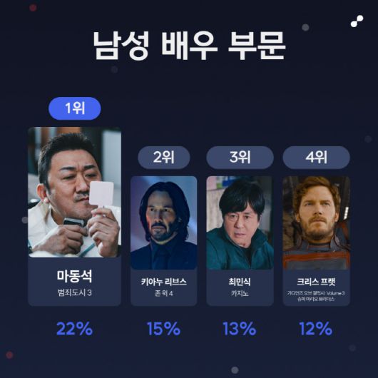 마지막으로 남성 배우 부문은 천만 영화 반열에 오른 <범죄도시 3>의 마석도를 연기한 마동석이 <존 윅 4>의 키아누 리브스, [카지노]의 최민식 등을 제치고 올 상반기 최고의 배우로 꼽혔다.