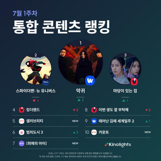 한편 7월 1주차 OTT 통합 콘텐츠 랭킹 1위는 김태리 [악귀]가 차지했다.