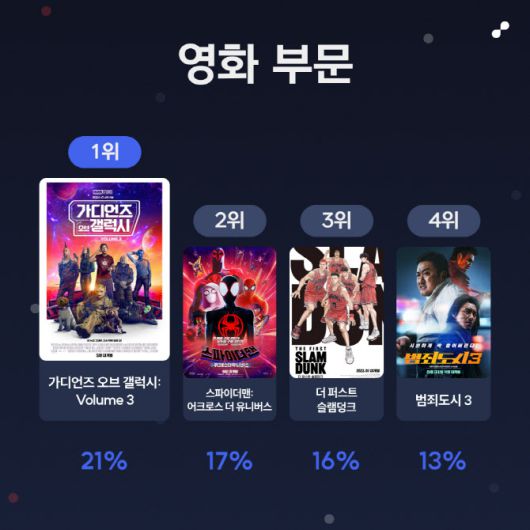 키노라이츠 상반기 결산 결과, 영화 부문 1위로는 21%의 표를 획득한 <가디언즈 오브 갤럭시: Volume 3>가 꼽혔다.