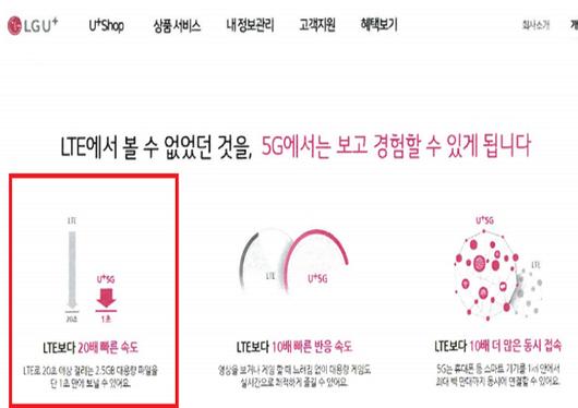 LG유플러스 5G 광고. 기존 4세대 이동통신인 LTE 대비 20배 더 빠르다는 문구가 쓰여 있다. [사진=공정거래위원회] |