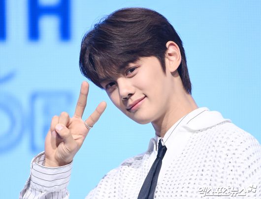 이날 쇼케이에 참석한 제로베이스원 김규빈이 포토타임을 갖고 있다.