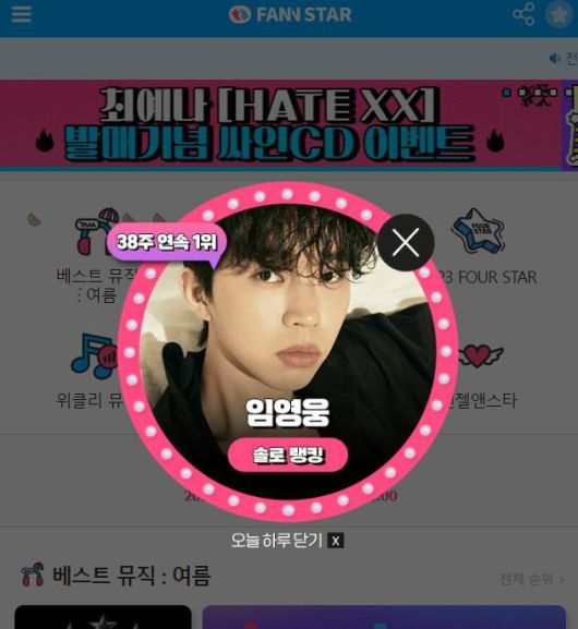 [더팩트 | 이나래 기자] 가수 임영웅이 주간 아이돌 랭킹사이트 '팬앤스타' 솔로 랭킹에서 38주 연속 1위를 차지했다.