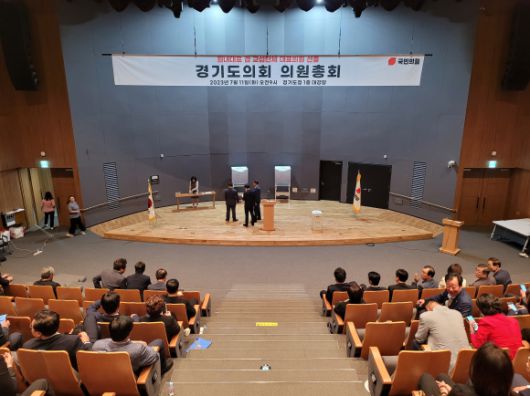 국민의힘 경기도당이 11일 경기도의회 1층 대강당에서 새 교섭단체 대표 선출을 위한 의원총회를 열고 있다. 명종원 기자 |