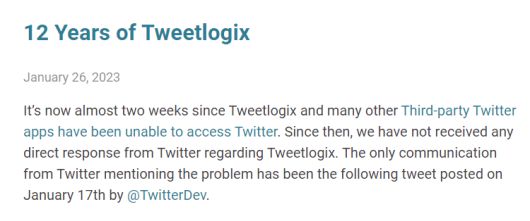 트윗로직스가 올해 초 12년간의 서드파티 트위터 앱 서비스를 종료한다고 발표했다. ⓒ Tweetlogix |