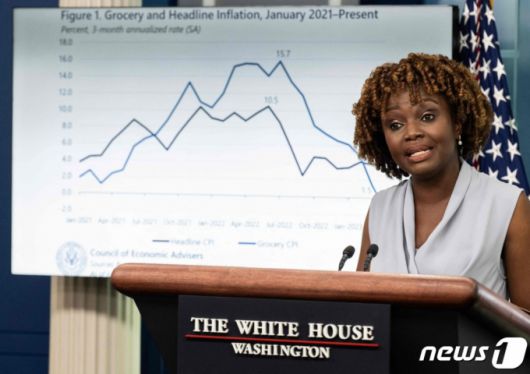 (워싱턴 AFP=뉴스1) 우동명 기자 = 카린 장-피에르 백악관 대변인이 7일 (현지시간) 워싱턴 백악관 브래디 룸에서 인플레이션 관련 브리핑을 하고 있다. 2023.6.8 ⓒ AFP=뉴스1 Copyright (C) 뉴스1. All rights reserved. 무단 전재 및 재배포 금지. |