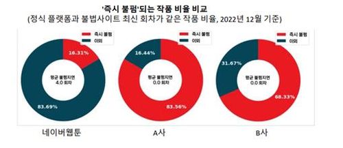 작년 12월 기준으로 최신 회차가 즉시 불법 유통된 작품의 비율은 네이버웹툰의 경우 16.3%였으나 A사는 83.6%, B사는 68.3%였다.
