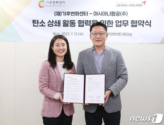 (서울=뉴스1) = 박수상 아시아나항공 상무(오른쪽)와 김소희 기후변화센터 사무총장이 12일 서울 종로구 기후변화센터 본사에서 '탄소 상쇄 활동 협력'을 위한 업무협약을 체결하고 있다. (아시아나항공 제공) 2023.7.12/뉴스1photo@news1.krCopyright ⓒ 뉴스1. All rights reserved. 무단 전재 및 재배포 금지.