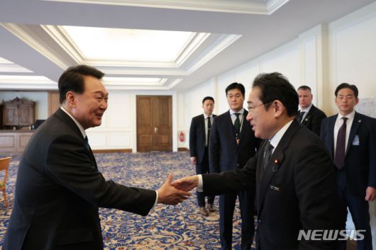 기시다 총리는 이날 리투아니아 빌뉴스에서 나토(NATO·북대서양조약기구)정상회의 계기로 윤 대통령과 한일 정상회담을 했다. 윤 대통령 취임 후 양 정상간 만남은 이번이 여섯번째다. 이날 기시다 총리가 회담장에 먼저 도착해 윤 대통령을 기다렸으며 윤 대통령이 도착하자 "안녕하세요"라고 한국어로 인사했다.
