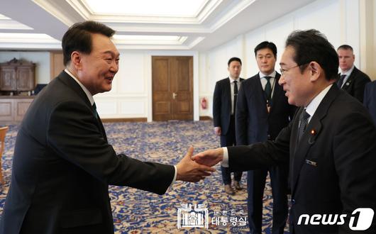 윤석열 대통령이 12일(현지시간) 리투아니아 빌뉴스의 한 호텔에서 열린 AP4(한국·일본·호주·뉴질랜드) 정상회동에서 기시다 후미오 일본 총리와 악수하고 있다. (대통령실 홈페이지) 2023.7.12/뉴스1 ⓒ News1 오대일 기자 |