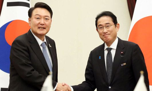 북대서양조약기구(NATO·나토) 정상회의 참석차 리투아니아를 방문 중인 윤석열 대통령이 12일 빌뉴스 한 호텔에서 열린 한일 정상회담에서 기시다 후미오 일본 총리와 악수하고 있다. 연합뉴스 |