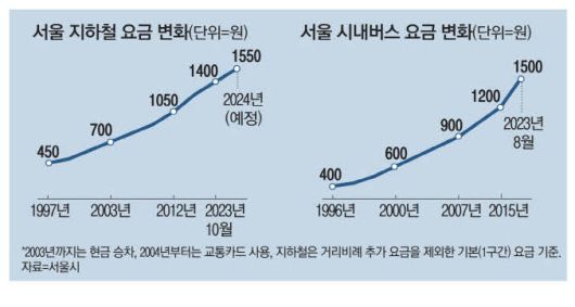 서울시가 지난해 12월 처음으로 지하철·버스 등 대중교통 요금 인상을 띄운 뒤 7개월여 만에 버스 300원, 지하철 150원을 인상하는 인상안을 도입하기로 했다. 서울에 버스와 지하철 도입된 이후 최장기간인 8년간 요금 동결이 이뤄졌다는 점과 지하철과 버스로 발생하는 적자가 한해 1조원을 넘는 상황에서 내린 고육지책이지만, 대중교통 요금 인상을 시작으로 물가인상이 동반될 수 있다는 우려도 나온다.