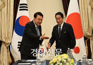윤석열 대통령이 12일(현지시간) 리투아니아 빌뉴스 한 호텔에서 기시다 후미오 일본 총리와의 정상회담에 앞서 악수하고 있다. 김창길 기자 |