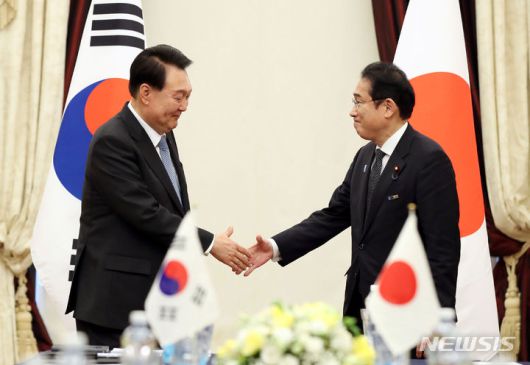 악수하는 윤석열 대통령과 기시다 후미오 일본 총리.[빌뉴스(리투아니아)=뉴시스] 전신 기자 = 윤석열 대통령이 12일(현지시간) 리투아니아 빌뉴스 한 호텔에서 열린 한일 정상회담에 앞서 기시다 후미오 일본 총리와 악수하고 있다. 2023.07.12. photo1006@newsis.com |