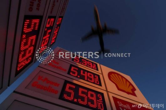 An aircraft flies over a sign displaying current gas prices as it approaches to land in San Diego, California, U.S., February 28, 2022. REUTERS/Mike Blake/File Photo |