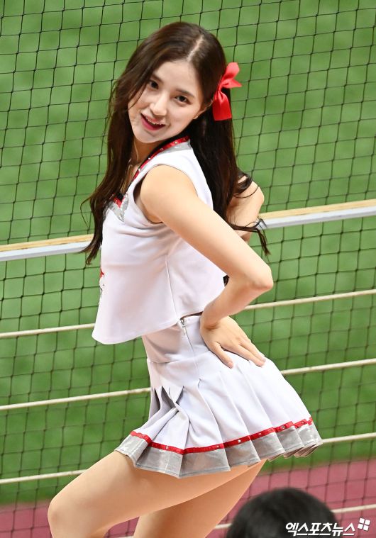 (엑스포츠뉴스 고척, 김한준 기자) 13일 오후 서울 구로구 고척스카이돔에서 열린 '2023 신한은행 SOL KBO리그' KT 위즈와 키움 히어로즈의 경기, KT 치어리더 김해리가 멋진 공연을 선보이고 있다. 김한준 기자 kowel@xportsnews.com