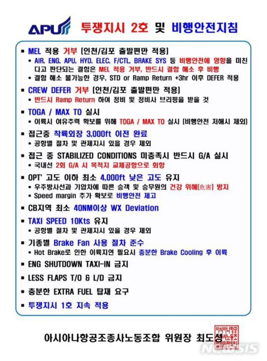 [서울=뉴시스]아시아나항공 조종사 노조는 이날부터 2차 쟁위행위 지침.(사진=아시아나항공 조종사 노조 제공) |