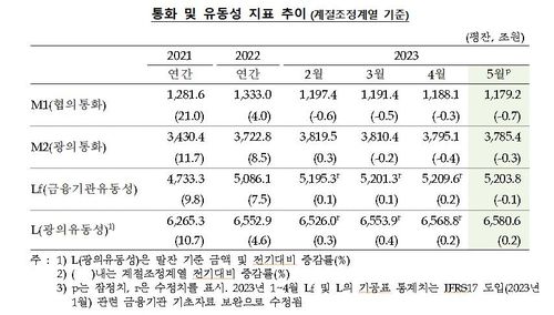 5월 현금·요구불예금·수시입출금식예금만 포함하는 좁은 의미의 통화량 M1(1천179조2천억원)도 전월 대비 0.7%(8조9천억원) 줄어 2022년 6월 이후 12개월째 감소세를 이어갔다.