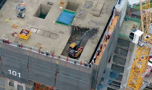 굴착기는 아래층에 미리 확보한 작업 공간에서 팔에 달린 압쇄기로 주변 상판(슬래브), 벽체를 부쉈다. 안전 확보와 비산 먼지 발생 방지를 위해 최상층 주변에는 RCS갱폼이 설치됐다. 구획된 작업대에 선 작업자가 해체되는 구조물 잔해 주변에 물을 뿌려가며 먼지 발생을 최소화했다. 현장 작업자와 안전 관리자 등 20여 명은 주변에서 해체 공정 과정을 지켜봤다. 현장 주변에 설치된 안전통제실에서는 작업 전 과정을 실시간 모니터링하며 발생할 수 있는 변수 등에 촉각을 기울였다.