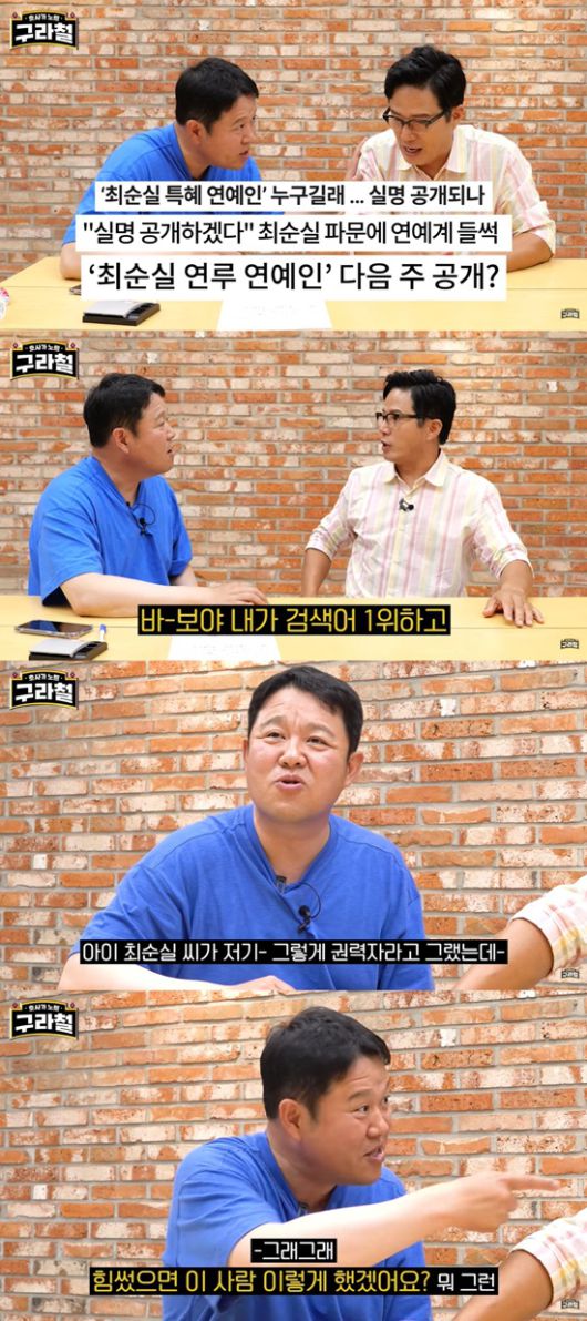 김구라는 "'마리텔' 때 나는 형이 그것 때문에 힘들어하는 거 알고 '아니다. 최순실 씨가 그렇게 권력자라고 했는데, 힘 썼으면 이 사람이 이렇게 했겠냐'고 얘기하지 않았냐"며 "'전혀 매력적이지도 않은 사람이 무슨 수로 권력자의 눈에 들겠냐'고 그냥 우스갯소리로 주변 사람들한테 얘기했는데, 어떻게 된거냐"고 물었다.