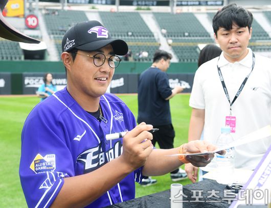 [부산=스포츠투데이 권광일 기자] '2023 KBO 리그 올스타전'이 15일 오후 부산 사직구장에서 열린다. 박건우가 올스타전 팬사인회에 참석해 사인을 하고 있다. 2023.07.15. [스포츠투데이 권광일 기자 sports@stoo.com]