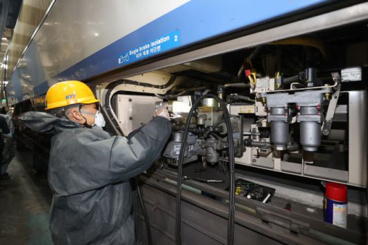 경기도 고양시 한국철도공사 수도권철도차량정비단에서 정비사가 철도를 정비하고 있다. (사진=연합뉴스) |