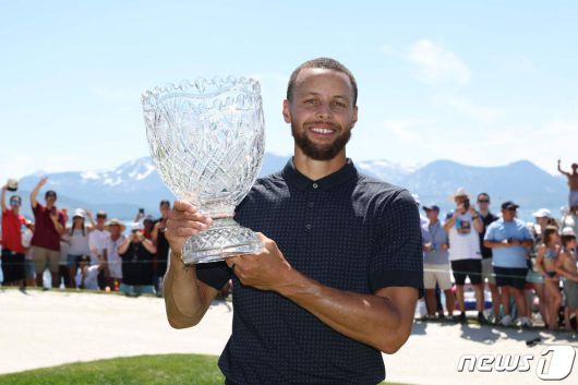 NBA 스타 스테픈 커리가 17일(한국시간) 아메리칸 센추리 챔피언십에서 우승한 뒤 트로피를 들어보이고 있다. ⓒ AFP=뉴스1 |
