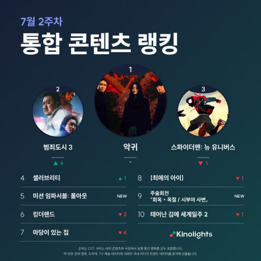 김태리 ‘악귀’, 2주 연속 콘텐츠 랭킹 정상...뒤쫓는 ‘범죄도시3’. OTT 통합검색 및 추천 플랫폼 키노라이츠가 7월 2주 차(7/6~7/12) 통합 콘텐츠 랭킹을 공개했다. |