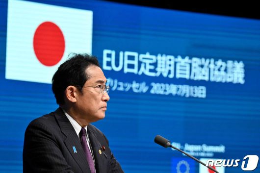13일(현지시간) 벨기에 브뤼셀 유럽연합(EU) 본부에서 열린 제29회 EU-일본 정상회담에 참석한 기시다 후미오 일본 총리가 연단에 서 있다. 2023.07.13/ ⓒ AFP=뉴스1 ⓒ News1 권진영 기자 |