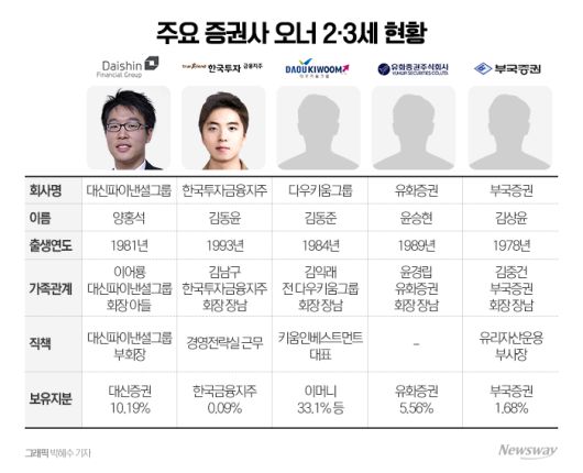 국내 증권사 오너 2~3세들이 본격적인 경영 승계에 나서고 있다. 이들은 계열사 등에 입사해 현장 경험을 쌓으며 경영 수업을 받으며 동시에 지분 매입에도 적극적이다. 증권가에선 조만간 오너 2~3세들의 경영 참여가 더욱 활발해질 것이란 전망이다.