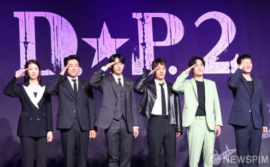 [서울=뉴스핌] 이호형 기자 = 배우 김지현(왼쪽부터)과 지진희, 정해인, 구교환, 김성균, 손석구, 한준희 감독이 18일 서울 강남구 그랜드 인터컨티넨탈 서울 파르나스에서 열린 넷플릭스 드라마 'D.P.' 시즌2 제작발표회에서 인사를 하고 있다. 'D.P.' 시즌2는 군무 이탈 체포조(D.P.) 준호(정해인 분)와 호열(구교환 분)이 여전히 변한 게 없는 현실과 부조리에 끊임없이 부딪치며 벌어지는 이야기를 그린 작품이다.2023.07.18 leemario@newspim.com