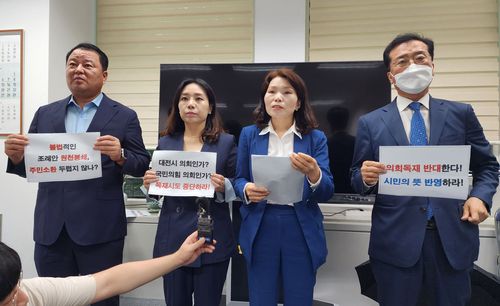 (대전=연합뉴스) 김준범 기자 = 대전시의회 더불어민주당 의원들은 18일 "국민의힘 시의원들이 조례 공동발의 서명을 거부하고 있다"고 주장하며 향후 의사일정 참여를 거부하고 나섰다.
