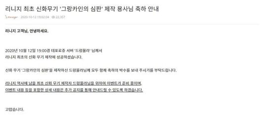 게다가 이 '집행검'을 10강까지 올려 만들어진 신화 아이템 '그랑카인의 심판'은 이보다도 훨씬 비싼 5억 정도의 가치로 예측 되고 있다.