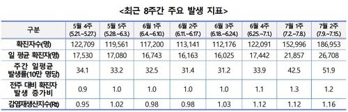 이 기간 일평균 확진자 수는 2만6천708명으로 직전 주보다 5천명 가까이 늘었다. 주간 일평균 확진자 수는 6월 3주 1만6천25명 → 6월 4주 1만7천442명 → 7월 1주 2만1천857명 → 7월 2주 2만6천708명으로, 증가세가 이어지고 있다.