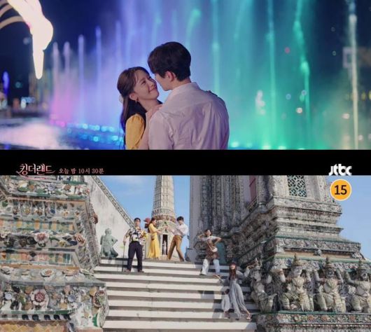 ‘킹더랜드’ 10화는 천사랑(임윤아 분)이 친구들과 함께 태국으로 포상 휴가를 떠나 태국의 다양한 장소를 누비면서 구원(이준호 분)과의 달콤한 비밀 연애를 한다. 드라마에는 태국의 수도 방콕에 위치한 왓아룬, 왓 라차나다의 로하 쁘라삿 등의 사원들과 전 세계 배낭족들의 집합소인 카이산 로드, 유명 쇼핑몰 아이콘시암, 시암광장을 비롯해 방콕 호텔, 오리엔탈 빌라, 반얀트리 호텔 및 태국 중부의 고대 도시 사뭇쁘라깐 등이 등장한다.