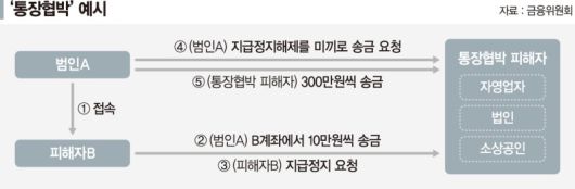 이른바 '통장협박'으로 불리는 신종 보이스피싱은 법의 허점을 이용해 멀쩡한 계좌를 정지시킨다. 보이스피싱 조직은 피해자를 유인해 특정 소상공인 계좌로 돈을 보내도록 한다. 이 피해자가 사기를 당했다며 해당 계좌를 수사당국에 신고하면 그 계좌는 지급정지상태가 된다. 이후 보이스피싱 조직이 계좌주인인 소상공인에게 "지급정지를 해제해주겠다"며 돈을 요구하는 방식이다. 통장협박은 최근 소상공인 계좌를 주요 표적으로 삼고 있다. 과거 온라인 불법 도박 사이트 이용자들이 사용하는 대포통장을 대상으로 삼았던 데서 양상이 변화한 셈이다. 지급정지 신청자 외에는 해제 신청을 할 수 없음에도 당장 영업이 시급한 소상공인의 어려운 상황을 노린 것이다.