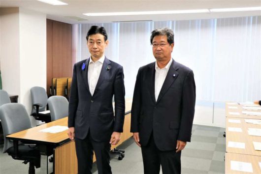 14일 일본 도쿄의 전국어업협동조합연합회(전어련) 사무실을 찾은 니시무라 야스토시 경제산업상(좌)과 사카모토 마사노부 전어련 회장이 기념 사진을 찍고 있다. (출처 : JF전어련 누리집) 2023.07.14/ |