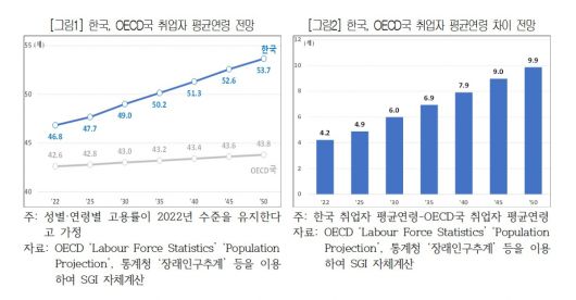 보고서에 따르면 지난해 국내 취업자의 평균 연령은 약 46.8세였다. 통계청 장래인구추계 자료를 바탕으로 현재의 성별·연령별 고용률이 유지된다는 가정하에 취업자 평균 연령을 추산한 결과 한국 취업자의 평균 연령은 2030년에 50세를 넘어섰다. 2050년에는 53.7세를 기록할 것으로 예측됐다. 경제협력개발기구(OECD) 국가들의 2050년 취업자 평균 연령 예상치인 43.8세보다 9.9세 높은 수준이다.