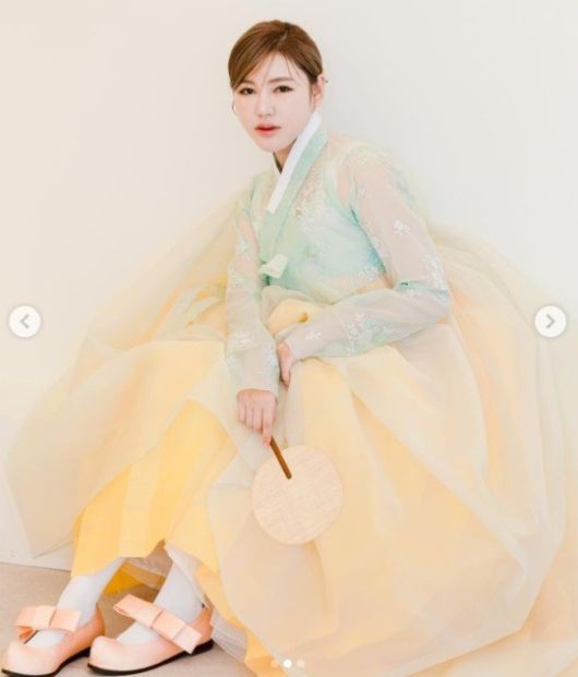 사진 속 송가인은 노란색 치마에 푸른색 저고리를 입고 단아한 자태를 보여준다. 송가인은 머리를 올려 우아함을 더했다.