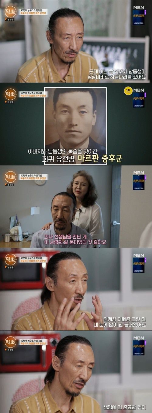 한기범은 “남동생이 심장마비로 하늘나라로 갔다. 대동맥이 있다. 혈관인데 혈관이 터져서 하늘나라로 가는 병이더라. 나도 그렇게 되겠구나”라며 가족력으로 마르판 증후군이라는 유전병을 털어놨다.