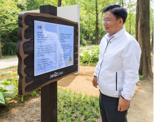박강수 서울 마포구 구청장이 6월 14일 상암 하늘공원 ‘시인의 거리’에 세운 자신의 시 표지판(‘사랑’)을 바라보고 있다. 출처: 마포구 |
